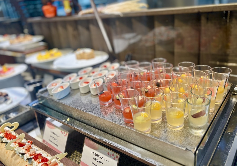スイーツコーナーには、いちごを使った華やかなデザートが充実。定番のショートケーキから繊細なグラスデザートまで、ホテルこだわりのラインナップが揃う。