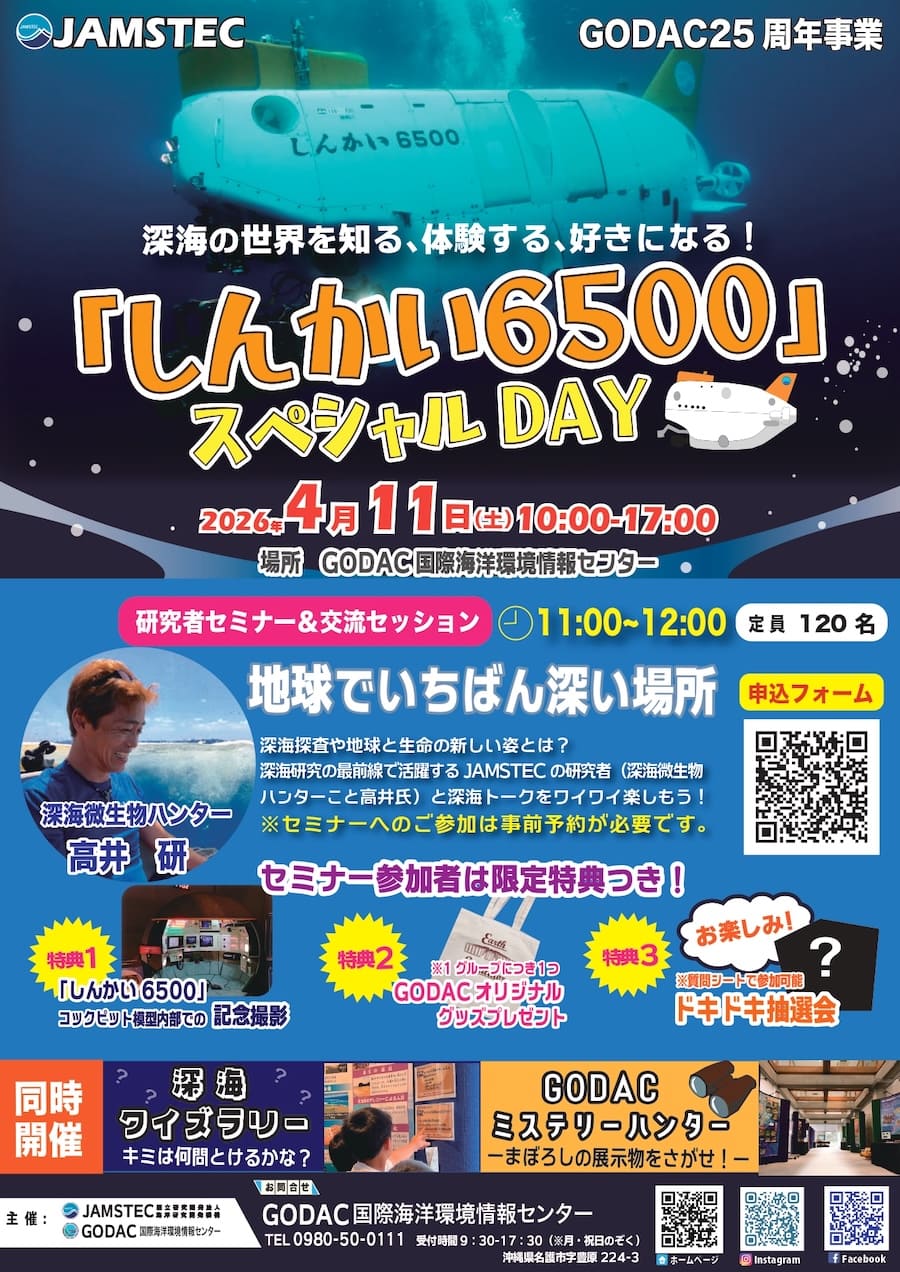2026年4月11日(土)、名護市の国際海洋環境情報センター(GODAC)にて、「しんかい6500 スペシャルDAY」が開催される。GODACの開館25周年を記念した本イベントは、最先端の深海研究に触れながら、親子で楽しめる体験型企画が満載。入場は無料で、気軽に参加できるのもうれしいポイントだ。