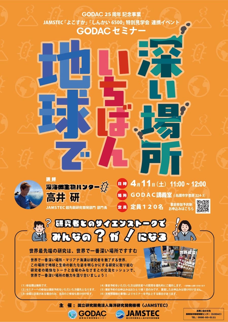 注目は、海洋研究の最前線で活躍するJAMSTECの研究者による特別セミナー&交流セッション「地球でいちばん深い場所」。講師には、深海微生物ハンターの高井研氏が登壇し、世界最深部・マリアナ海溝の魅力や、そこから見えてくる地球と生命の新たな姿について語る。セミナーは事前申込制。