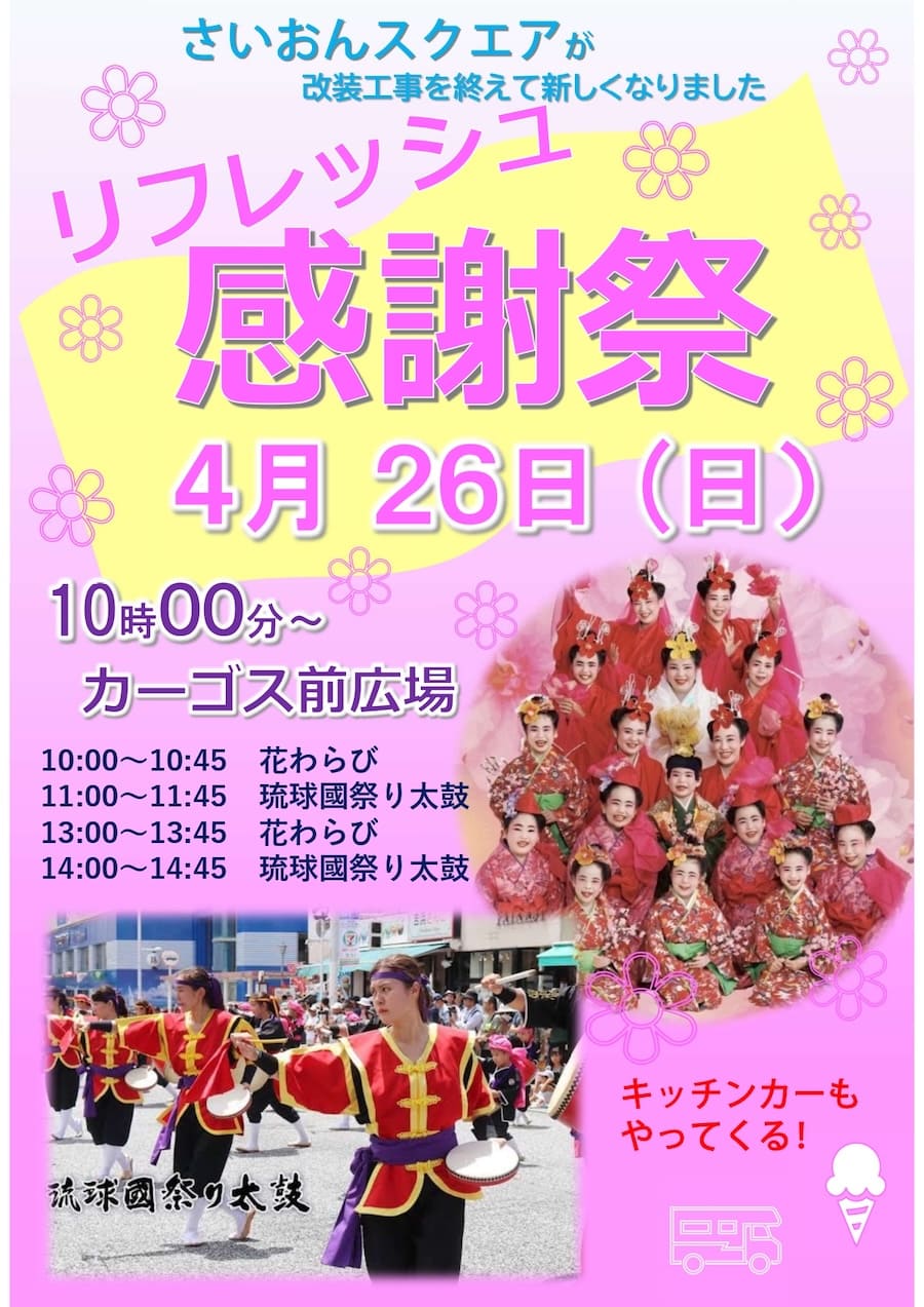昨年から今年3月にかけて行われた改装工事を経て、新しく生まれ変わったカーゴス。そのリニューアルを祝う「リフレッシュ感謝祭」が、2026年4月26日(日)にさいおんスクエアのカーゴス前広場にて開催される。