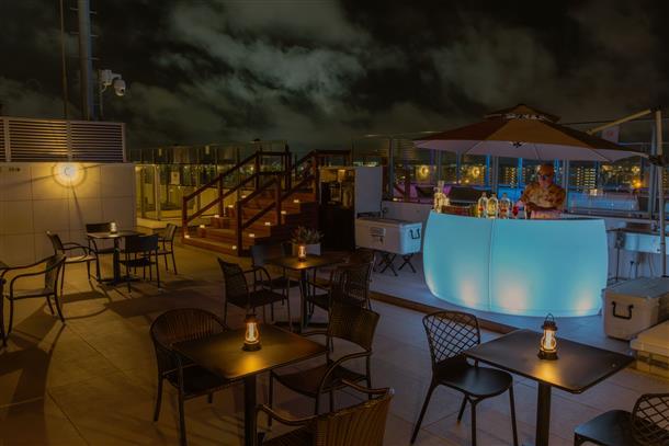 地上約48mのルーフトップ「Sky Lounge」で、那覇の空と海を一望。