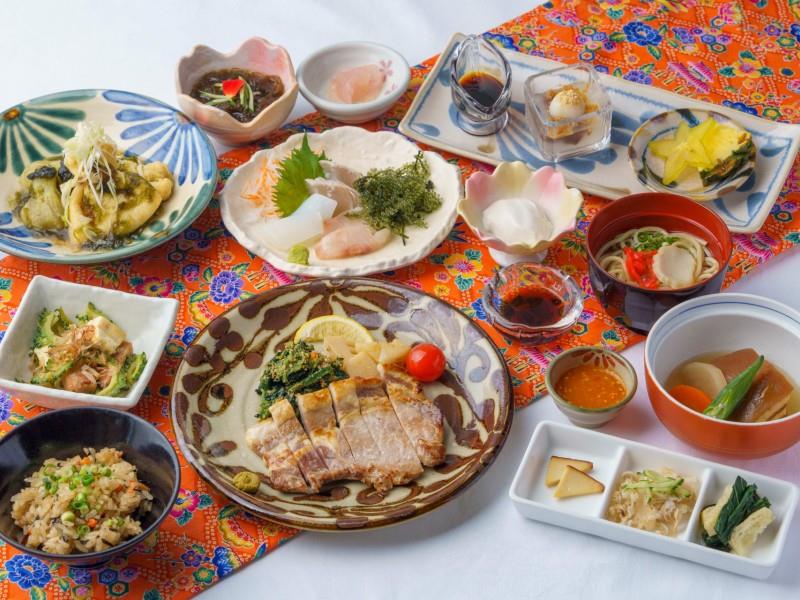 前菜 琉球料理四品・ジーマーミー豆腐お刺身 お刺身盛り合わせ三品・県産海ぶどう炒め物 ゴーヤーチャンプルー煮の物 ラフテーメイン 県産魚のバター焼き冷製鍋 海鮮島ぬ涼みスープお食事 ジューシー・沖縄そば・香の物水菓子 本日のデザート
