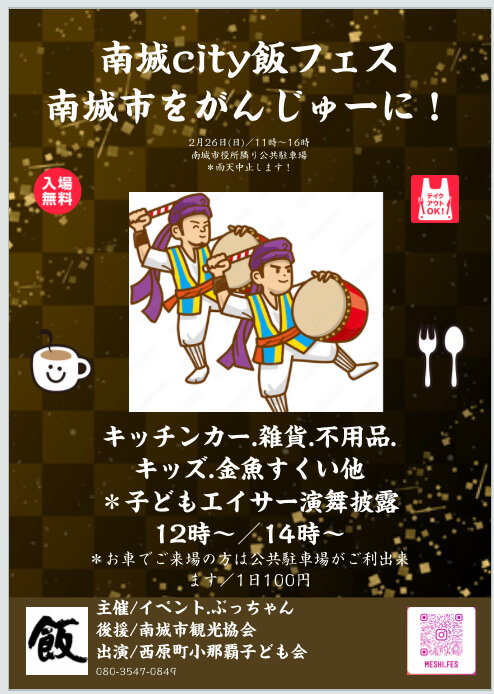 2023年2月26日(日)、南城市役所の隣りにある公共駐車場にて「南城city飯フェス」が開催される。