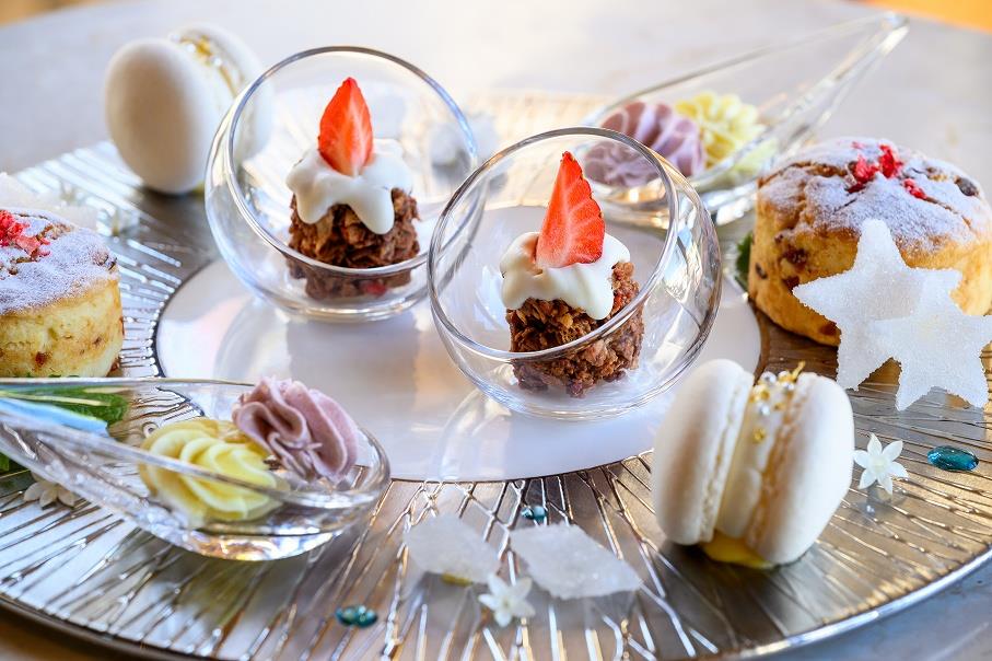 「LAS LUCES(ラスルセス)」をテーマに、「光」をイメージした料理とスイーツをご用意しました。夜空を描いた「黒ごまチーズカナッペ、星空仕立て」や、もちもちの白玉を挟んだやさしい風味の「ミニクロワッサンのずんだ餡バター餅サンド」のほか、和のデザインを洋風にアレンジした「雪うさぎの大福タルト」、太陽から着想を得た「アセロラヴェールを纏った朝日のオレンジムース」など、きらめきく光に包まれる至福のティータイムをお過ごしいただけます。