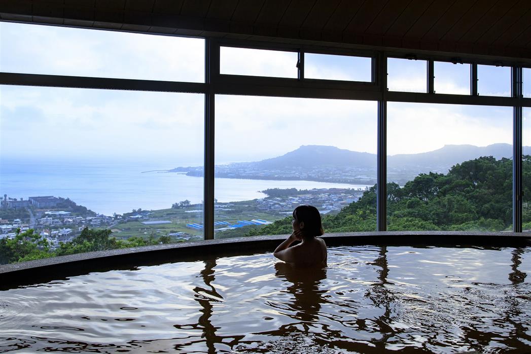 沖縄では珍しい天然温泉「猿人の湯」は、ろ過・加温・加水を一切していない自然の恵みそのままの源泉かけ流し温泉です。眺望抜群で昼は青い空と海をお楽しみいただけます。